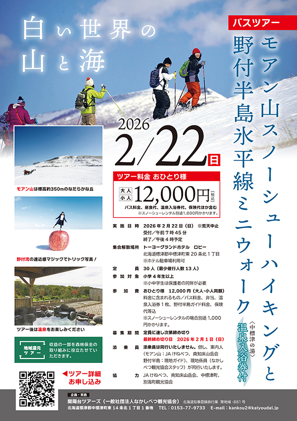 「モアン山スノーシューハイキングと野付半島氷平線ミニウォークバスツアー」